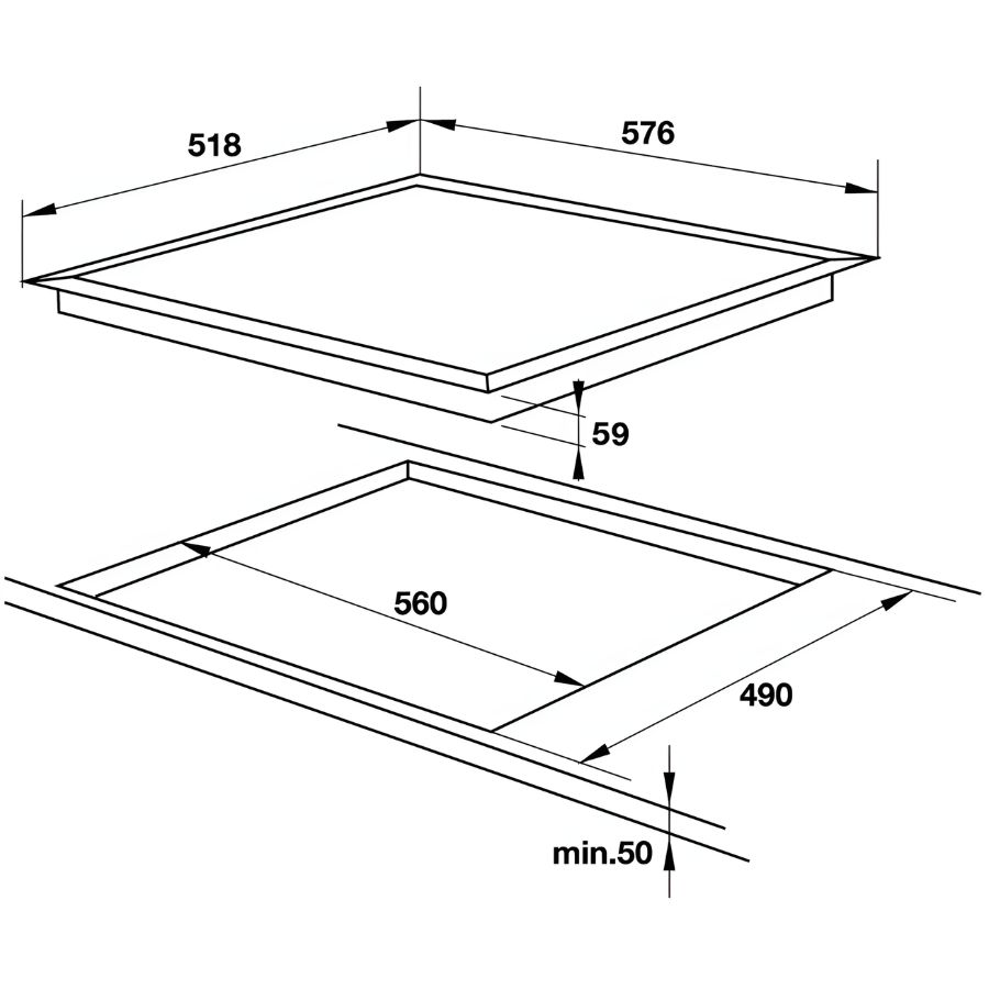 Kích thước lắp đặt: Ngang 560 x Sâu 490 x Cao tối thiểu 50 mm