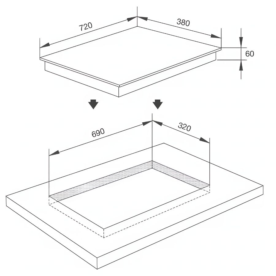 Kích thước bếp: Ngang 720 x Sâu 380 x Cao 60 mm