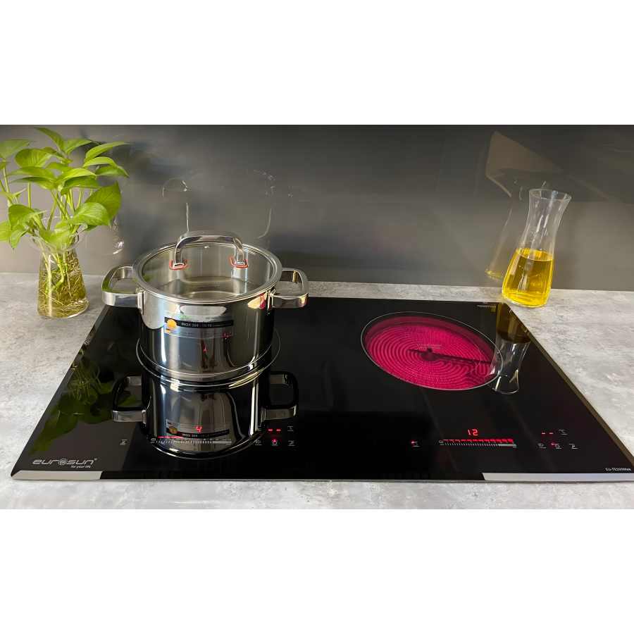Bếp điện từ Eurosun EU-TE316 - 3 vùng nấu, công nghệ Inverter tiết kiệm điện. Thiết kế sang trọng, nấu nhanh, an toàn với mặt kính Schott Ceran cao cấp.