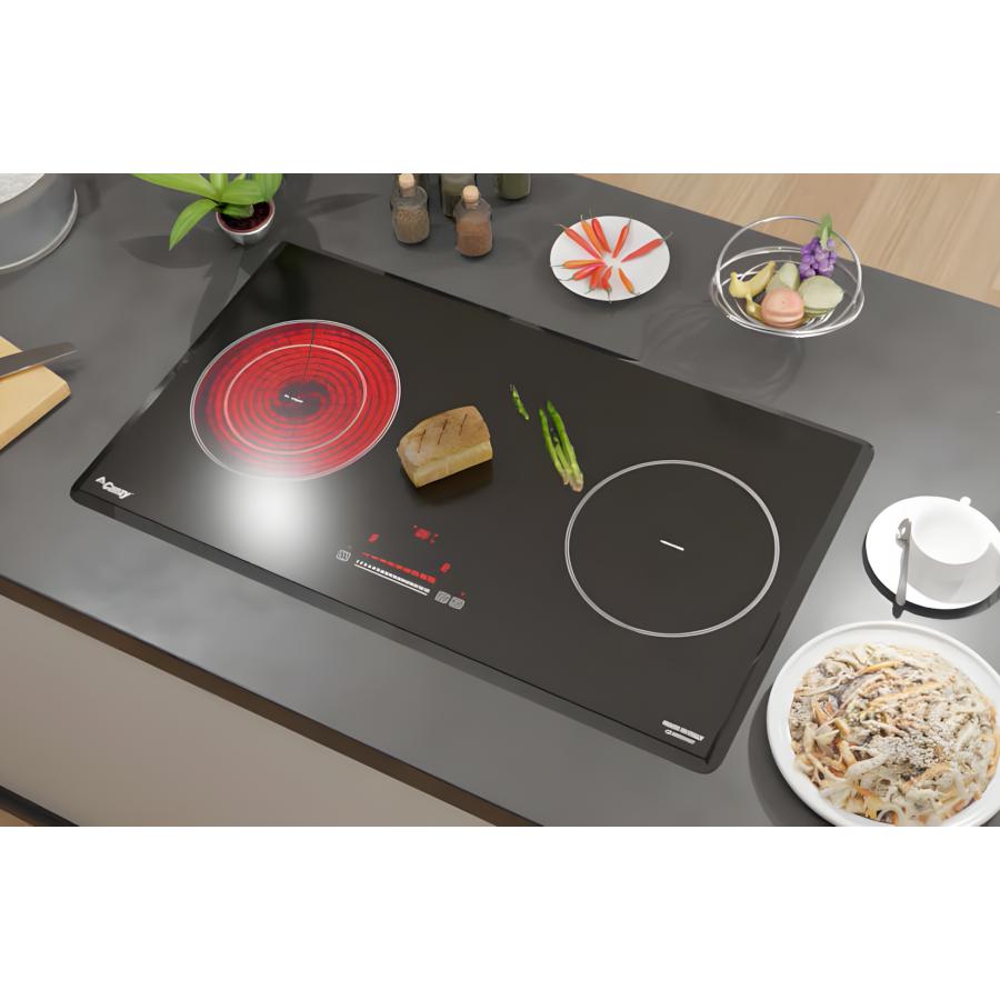 Thiết kế kết hợp 2 trong 1: Bếp có một vùng nấu từ với công suất 2300W và một vùng nấu hồng ngoại với công suất 3300W. Vùng hồng ngoại có chế độ hâm 2 vòng lửa, không kén nồi. Cả hai vùng đều có chức năng Booster giúp làm nóng nhanh và tiết kiệm thời gian.