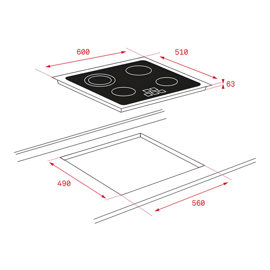 4 Vùng Nấu Vitroceramic Đa dạng: Bếp có 4 vùng nấu với các kích thước tiêu chuẩn: 1 vùng Ø210mm, 1 vùng nấu Ø180mm, và 2 vùng nấu Ø145mm, đáp ứng mọi nhu cầu nấu nướng hàng ngày.
