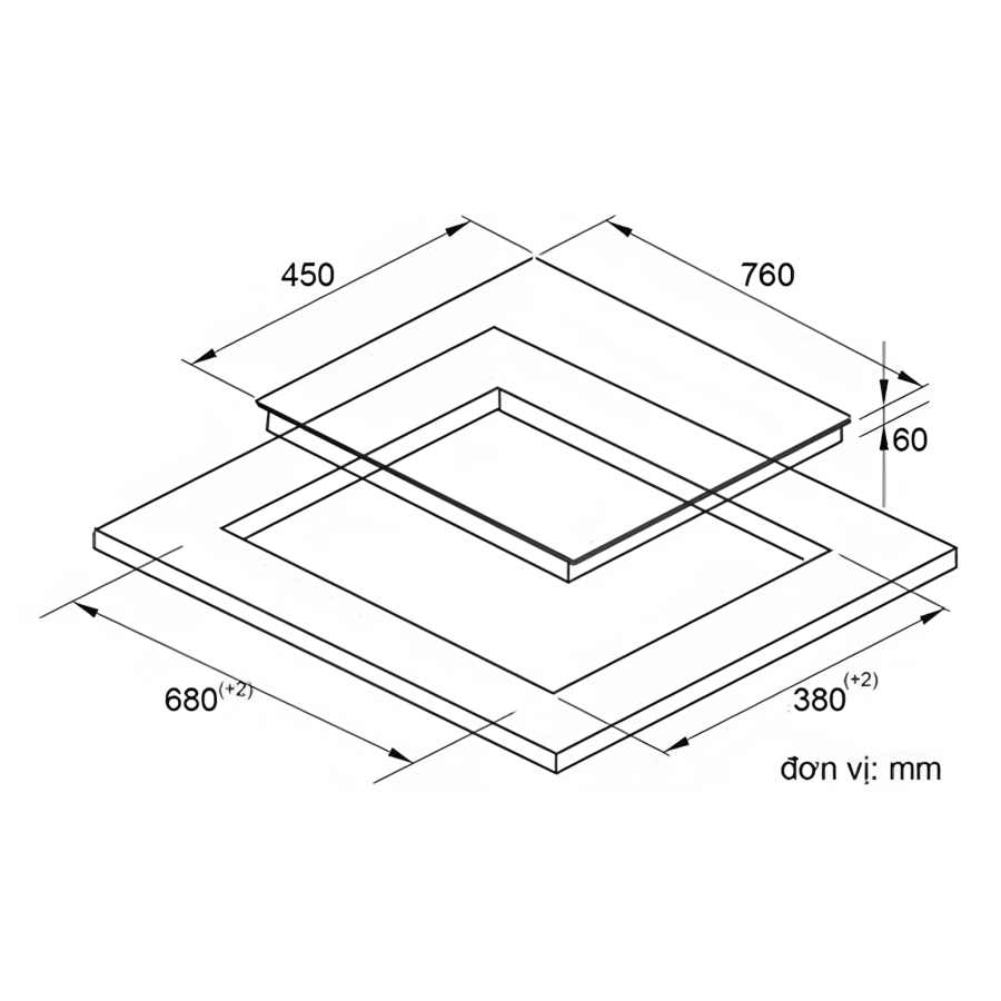 Lắp đặt: Lắp bếp vào lỗ đá với kích thước chính xác (680 x 380 mm) để đảm bảo an toàn và thẩm mỹ.
