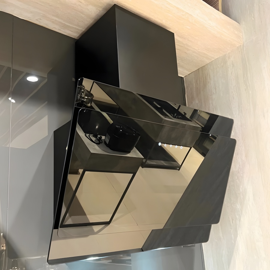 Thiết kế sang trọng, hiện đại: Máy có kiểu dáng gắn tường với thân máy bằng kính đen tinh tế, mang lại vẻ đẹp đẳng cấp cho căn bếp.