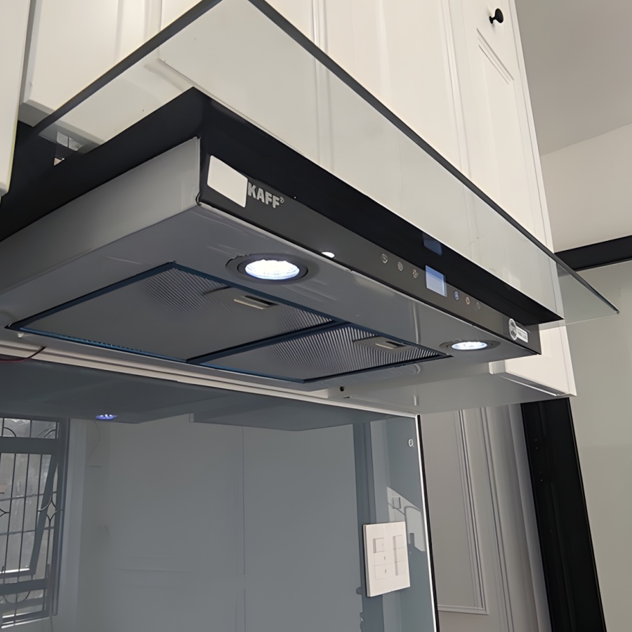 Máy hút mùi Kaff KF-AT70H/AT90H kính vát: Công suất 1000m³/h+. Thiết kế kính đen sang trọng, vận hành cảm ứng. Khử mùi hiệu quả, tiết kiệm không gian.