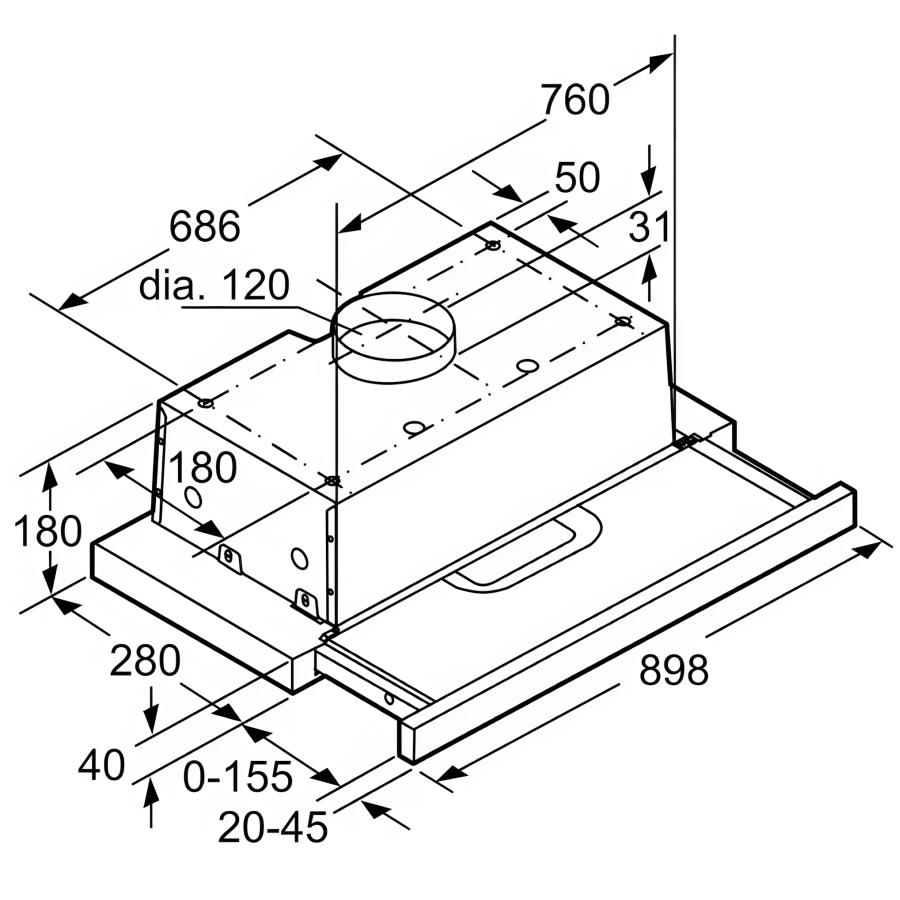 Thiết kế âm tủ: Với kích thước 898R x 300S x 180C mm, Máy hút mùi Bosch HMH.DHI923GSG - Series 4 được lắp đặt ẩn trong tủ bếp, giúp không gian bếp trở nên gọn gàng và tinh tế hơn.