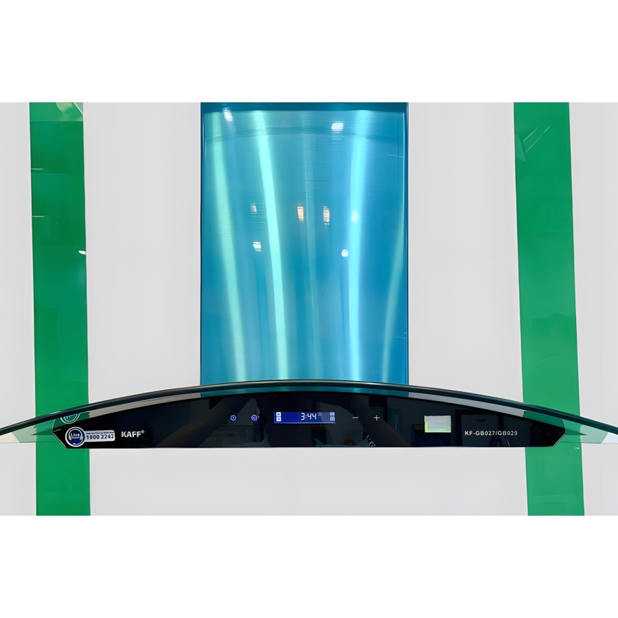 Máy hút mùi Kaff AT90LH kính vát 90cm: Thiết kế kính đen sang trọng, công suất 1200m³/h. Vận hành êm ái, điều khiển cảm ứng. Khử mùi hiệu quả.