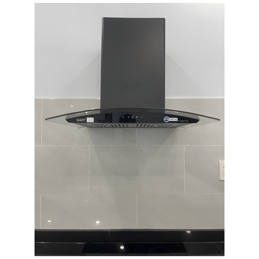 Máy hút mùi Kaff AT90LH kính vát 90cm: Thiết kế kính đen sang trọng, công suất 1200m³/h. Vận hành êm ái, điều khiển cảm ứng. Khử mùi hiệu quả.