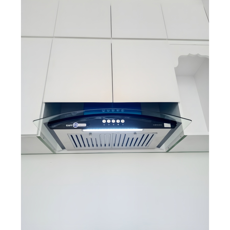 Máy hút mùi Kaff AT90LH kính vát 90cm: Thiết kế kính đen sang trọng, công suất 1200m³/h. Vận hành êm ái, điều khiển cảm ứng. Khử mùi hiệu quả.