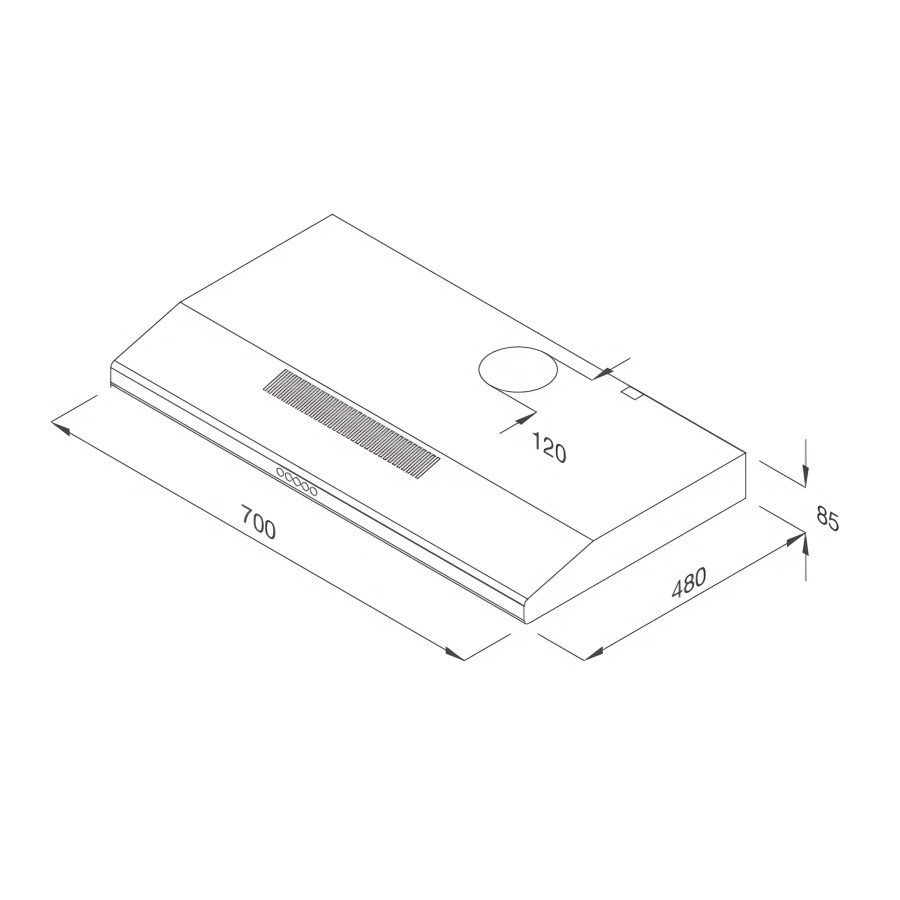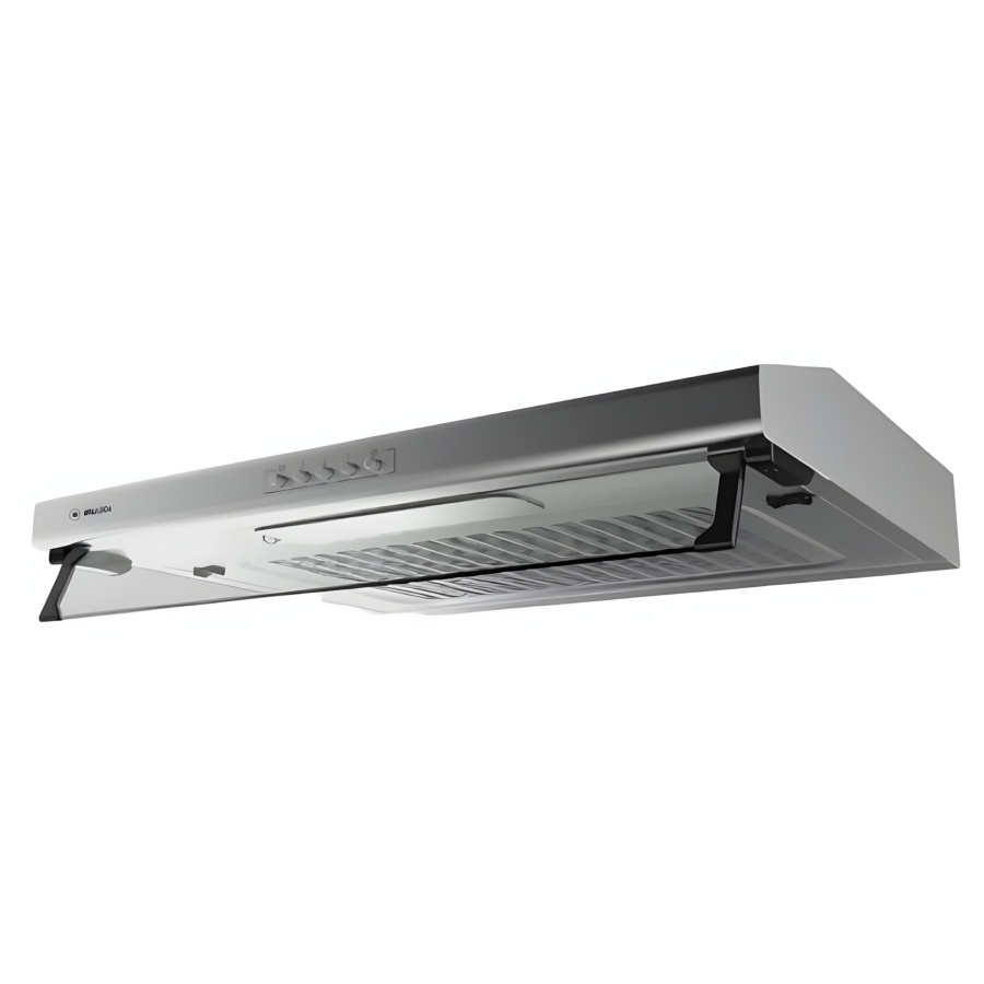 Khử mùi hiệu quả: Máy sử dụng hai phương pháp khử mùi: than hoạt tính (dạng tấm lọc xốp đen) và ống thoát Ø120, đảm bảo không khí trong bếp luôn sạch sẽ.