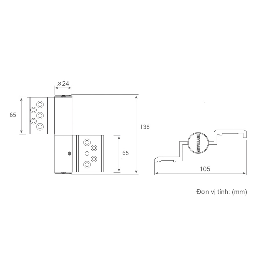 Bản lề 2D dài Huy Hoàng Hệ 55: Hợp kim Nhôm, mạ Điện Zi Titan. Cối Ø24mm, chốt Inox, chịu lực tốt. Dùng cho cửa nhôm Hệ 55, bền màu, giá tốt.