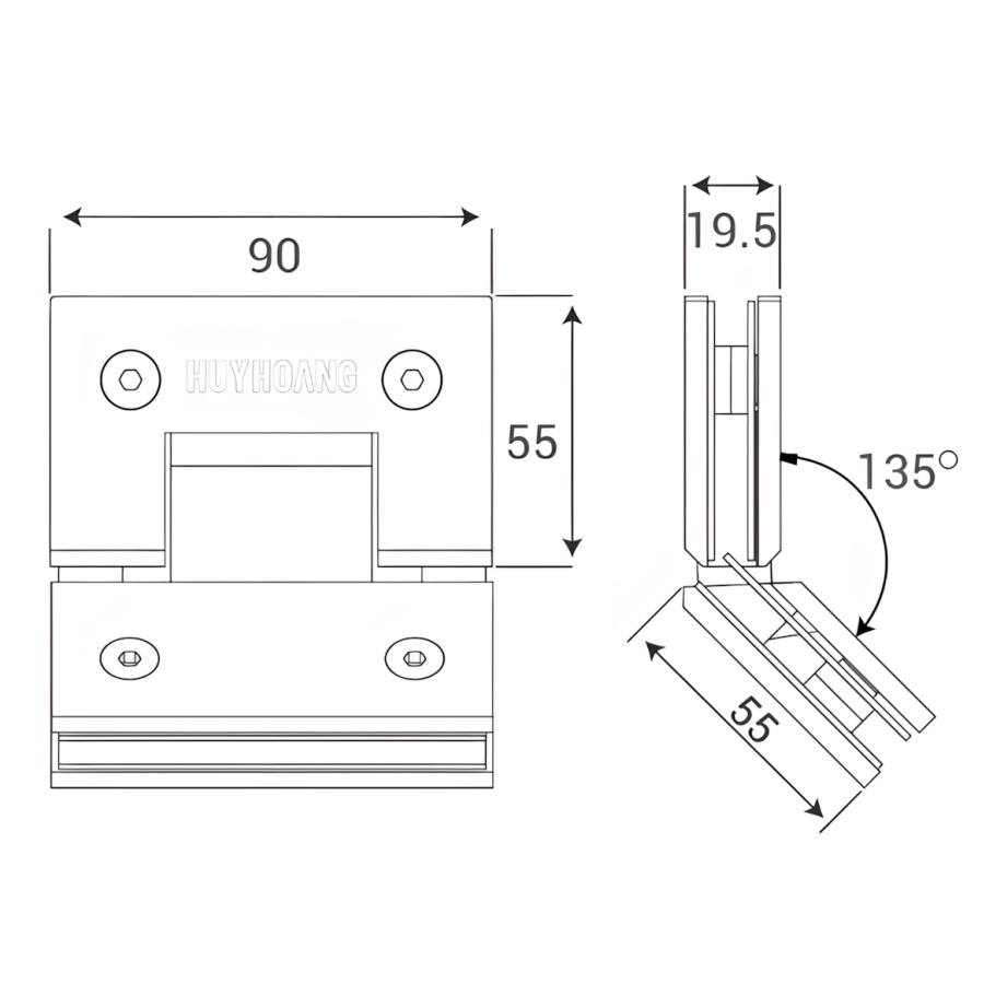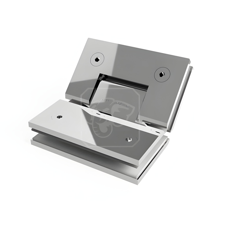 Thiết kế chuyên dụng 135 độ: Bản lề được lắp đặt giữa hai tấm kính với góc cố định 135 độ, thường dùng cho các vách ngăn phòng tắm kính (cabin tắm) để đảm bảo độ chắc chắn.