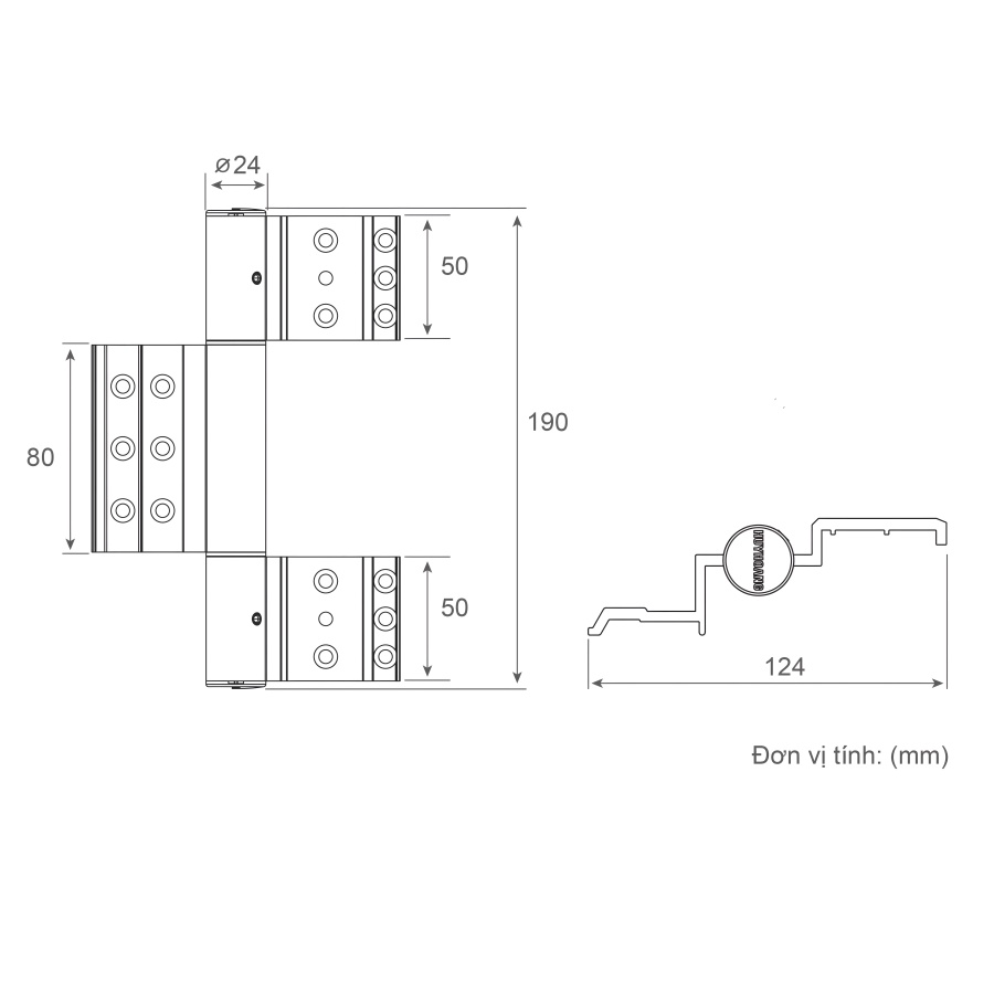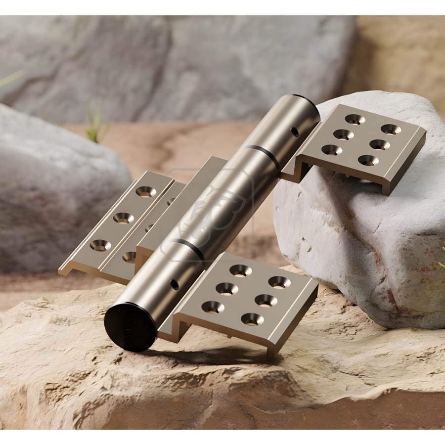 Chất liệu & Độ cứng vượt trội: Bản lề được làm từ nguyên liệu chính là nhôm 6063-T5, nổi tiếng về độ bền. Các chi tiết được nâng cấp, tăng kích thước của cối bản lề, và có gân tăng cứng để tăng cường độ cứng vững.