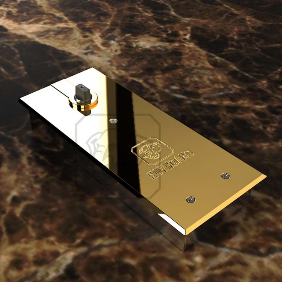 Bản lề sàn Huy Hoàng SS 03 (Tải 150kg): Nắp Inox mạ Titan Vàng. Đóng mở 2 chiều, điều chỉnh tốc độ. Lý tưởng cho cửa kính cường lực/cửa gỗ cỡ lớn, vậ...