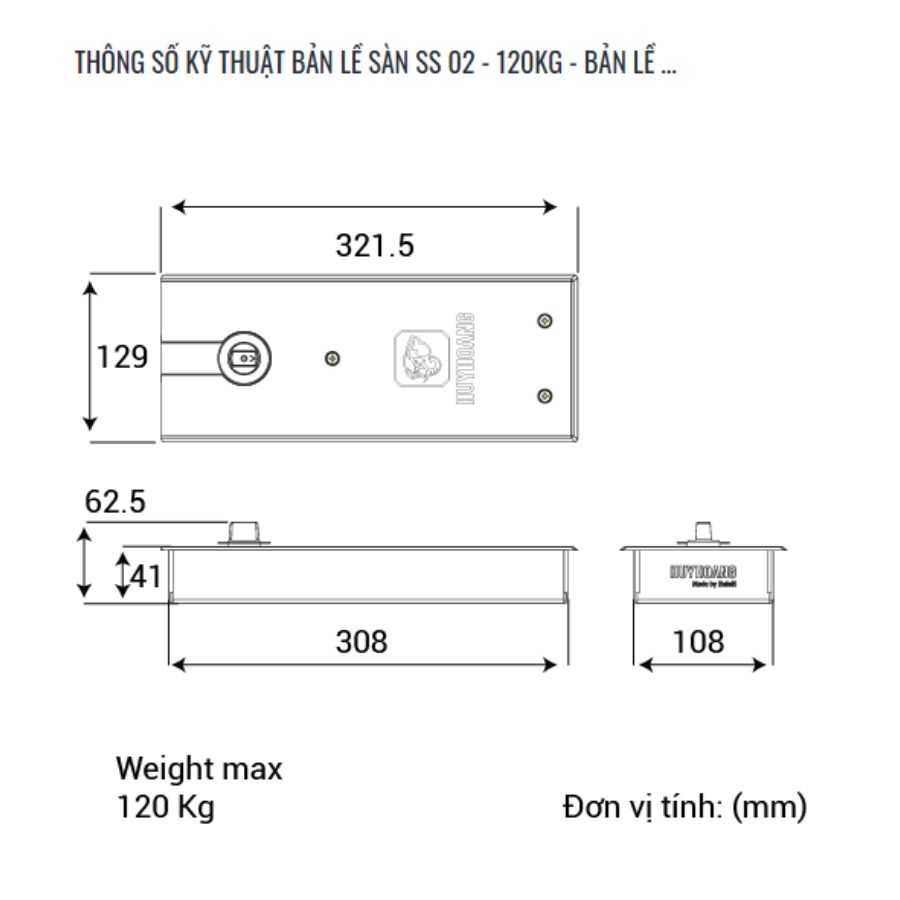 Chịu tải và Độ bền cao: Bản lề có khả năng chịu tải lên đến 120kg, phù hợp với các cánh cửa có chiều rộng tối đa 1150 x 2300 mm. Hộp bản lề được làm bằng Inox 304 (Thép không gỉ) và Thân bản lề bằng Thép hợp kim chắc chắn, đảm bảo tuổi thọ cao.
