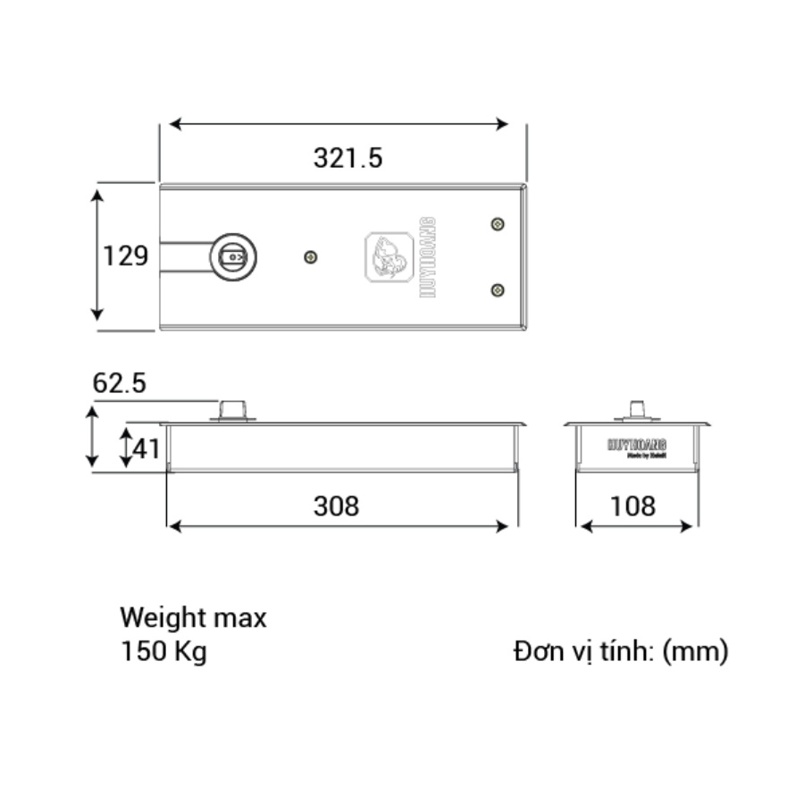 Chịu tải Rất lớn: Bản lề có khả năng chịu tải lên đến 150kg, phù hợp với các cánh cửa lớn và nặng, với chiều rộng tối đa 1250mm.