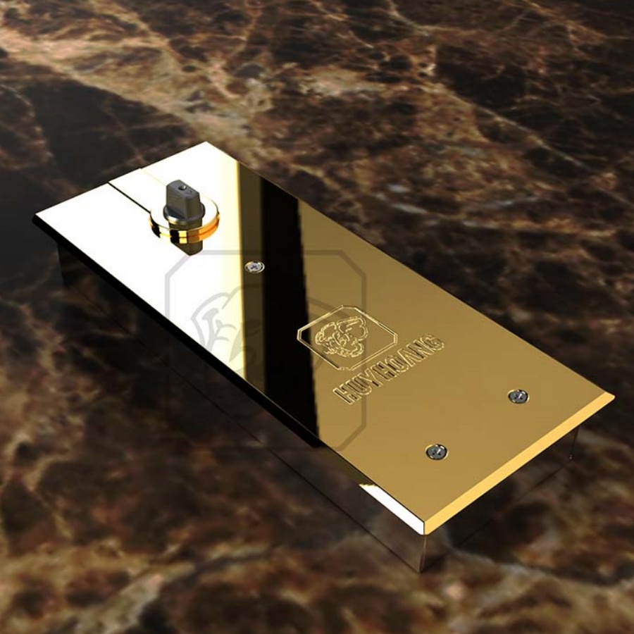 Bản lề sàn Huy Hoàng SS 02 (120kg): Nắp Inox mạ Titan Vàng. Đóng mở 2 chiều, điều chỉnh tốc độ. Lý tưởng cho cửa kính cường lực/cửa gỗ cỡ vừa, sang trọ...