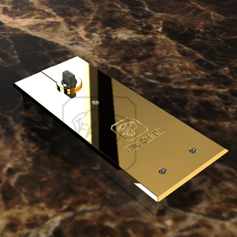 Bản lề sàn Huy Hoàng SS 02 (120kg): Nắp Inox mạ Titan Vàng. Đóng mở 2 chiều, điều chỉnh tốc độ. Lý tưởng cho cửa kính cường lực/cửa gỗ cỡ vừa, sang trọ...