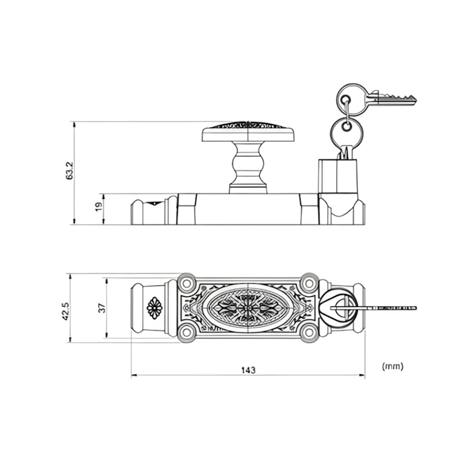 Chất liệu Hợp kim ZDC-2 & Mạ Đồng: Tay vặn cremone EX 06 được sản xuất bằng hợp kim ZDC-2 (Hợp kim kẽm). Bề mặt được mạ đồng giả cổ (hoặc Ni-Cr, sơn tĩnh điện tùy phiên bản), mang lại vẻ ngoài cổ điển, ấn tượng.
