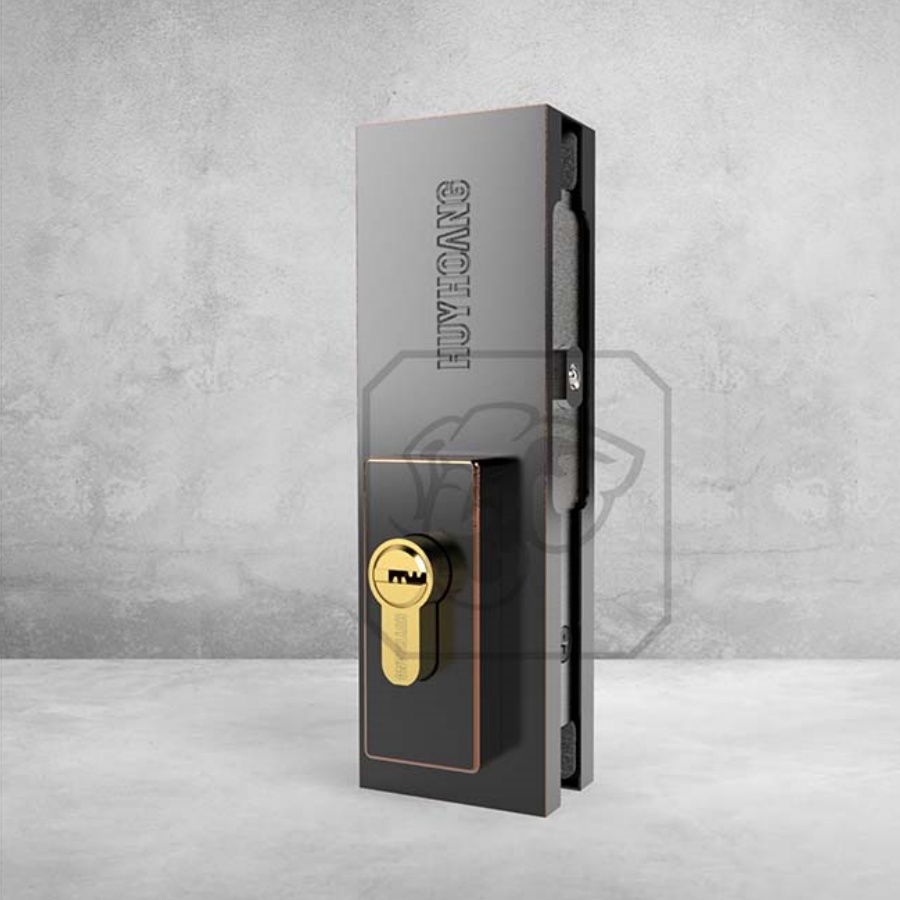 Kẹp kính khóa Huy Hoàng 05 Vàng: Inox 304 mạ Vàng. Dùng cho cửa kính (10-15mm), tích hợp ổ khóa chìa cơ. Phụ kiện cường lực, chống gỉ, thẩm mỹ cao.