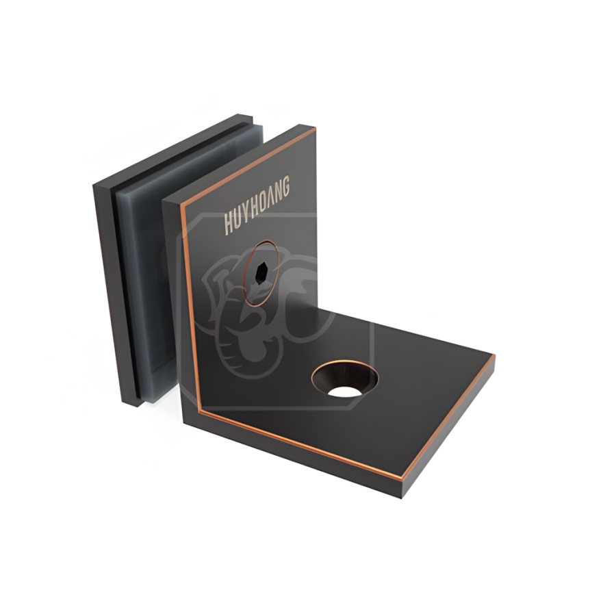 Kẹp vách 01 kính-tường Huy Hoàng: Inox 304 mạ Đồng Đen American. Cố định kính 8-12mm với tường (góc 90°). Bền bỉ, chống gỉ, cho phòng tắm kính.
