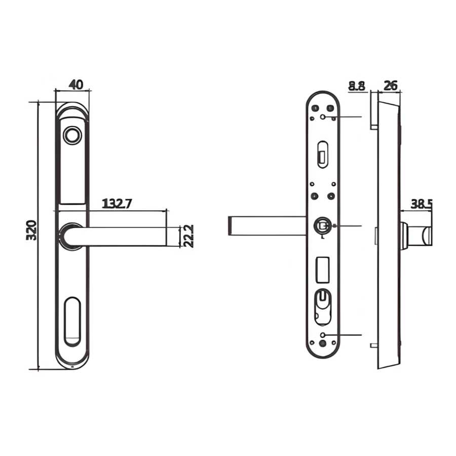 Kích thước thân khóa ngoài (RxCxD): 40 x 320 x 26 mm
