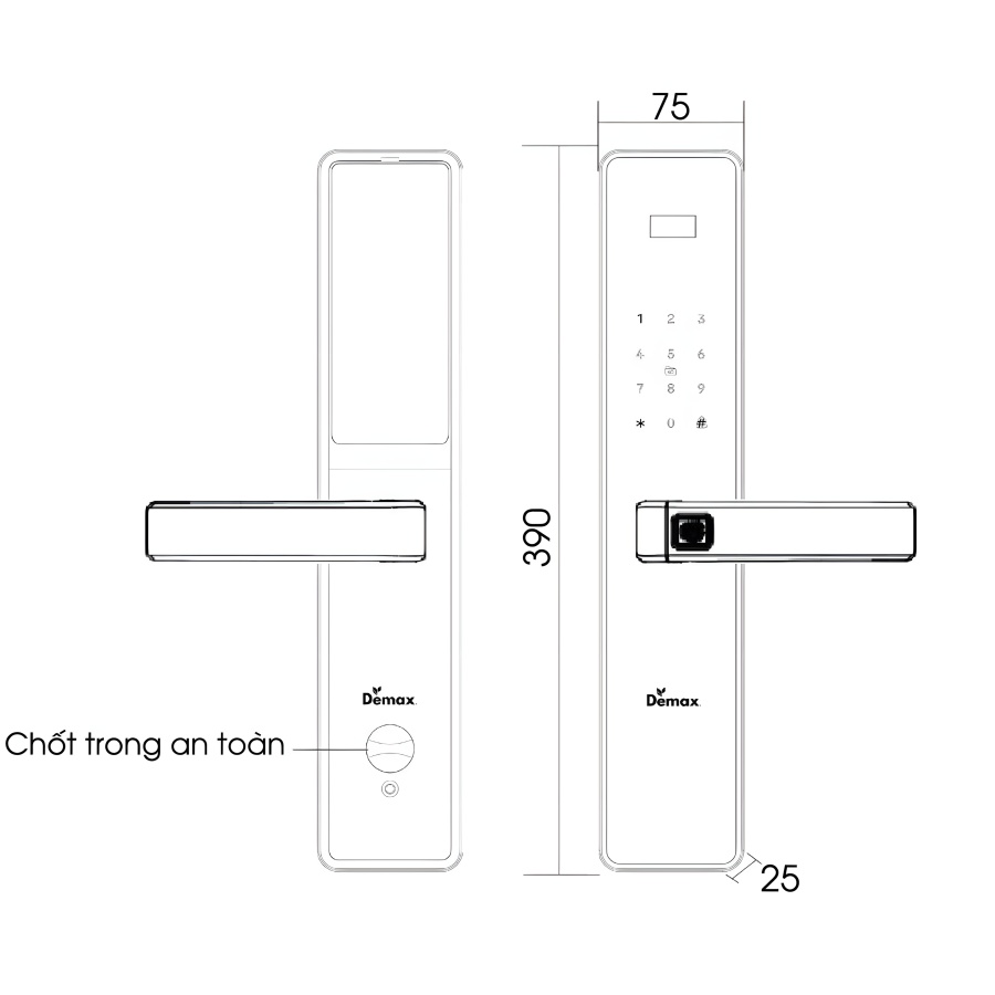 Kích thước khóa (Rộng x Cao x Dày): R75 × C390 x D25 mm