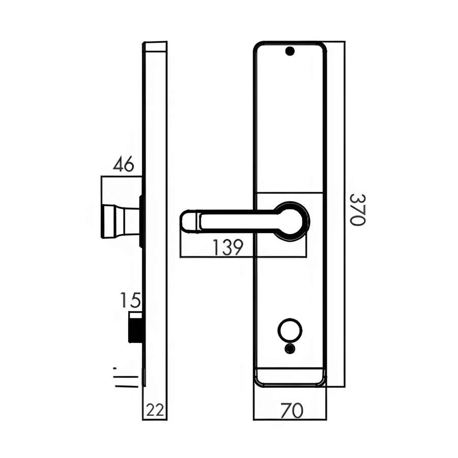 Kích thước thân khóa ngoài: R 70× C 370× D 22 mm.