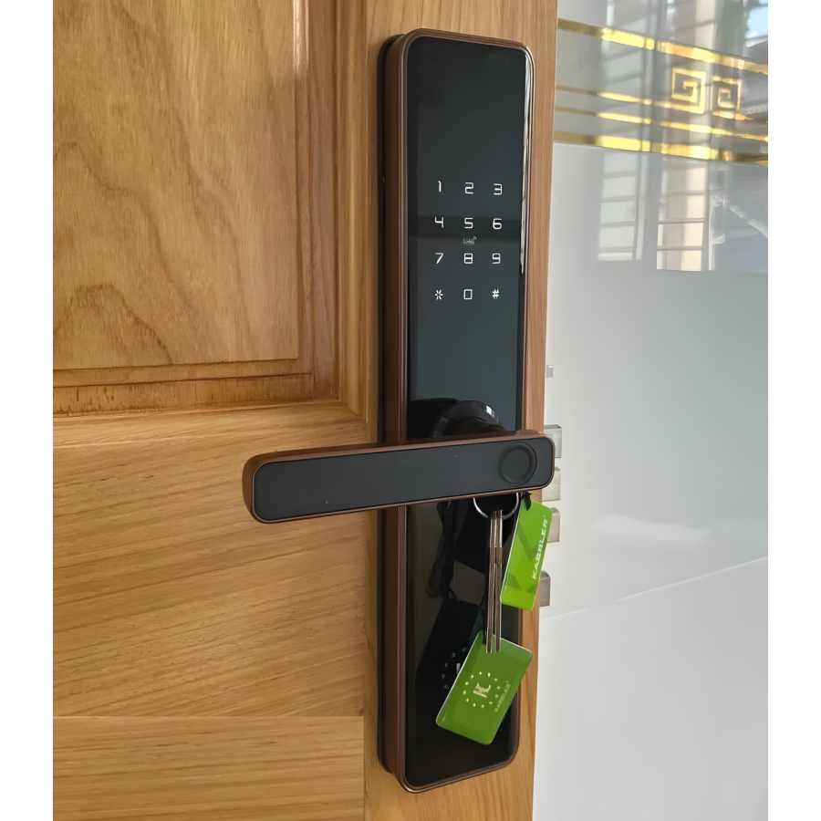 Khóa điện tử Kassler KL-828F APP thông minh, tích hợp App, vân tay, mã số, thẻ từ, chìa cơ. Thiết kế hiện đại, an toàn tuyệt đối, quản lý từ xa tiện lợi.