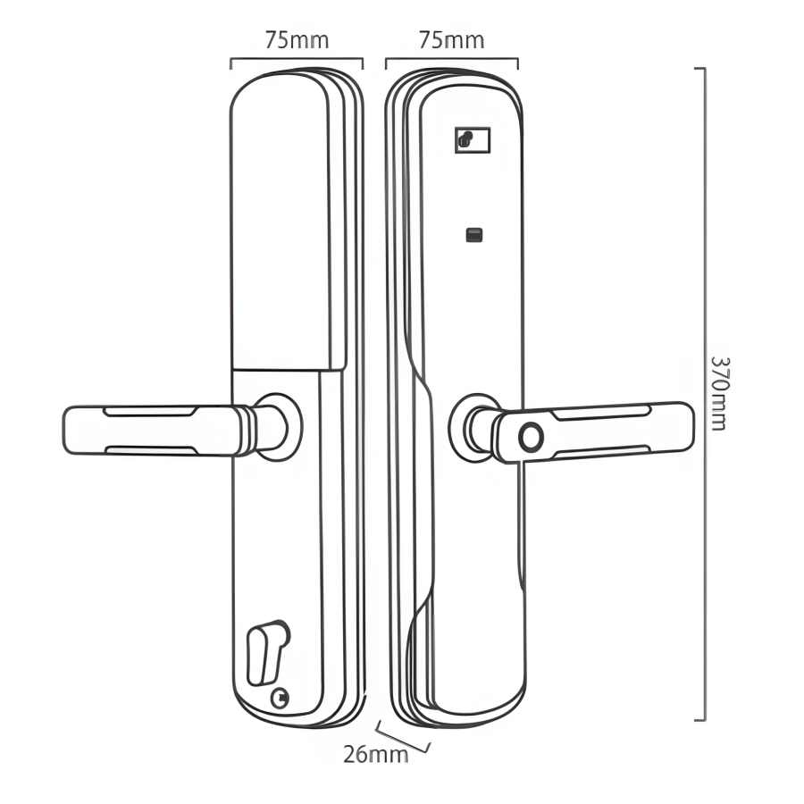 Kích thước thân khóa ngoài: R 75× C 370× D 26 mm.