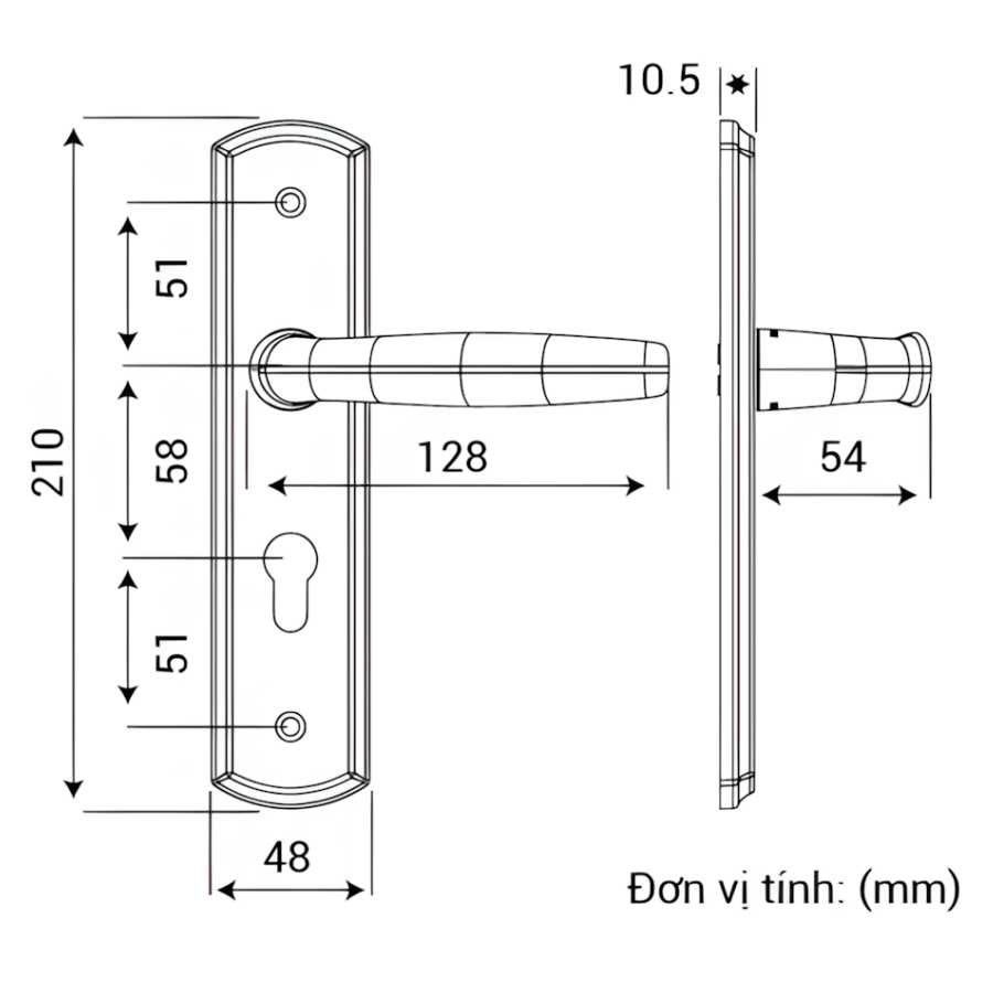 Chất liệu: Đồng vàng (Đồng thau - Tay ốp, Then khóa), Thân Inox/Thép mạ Zn.