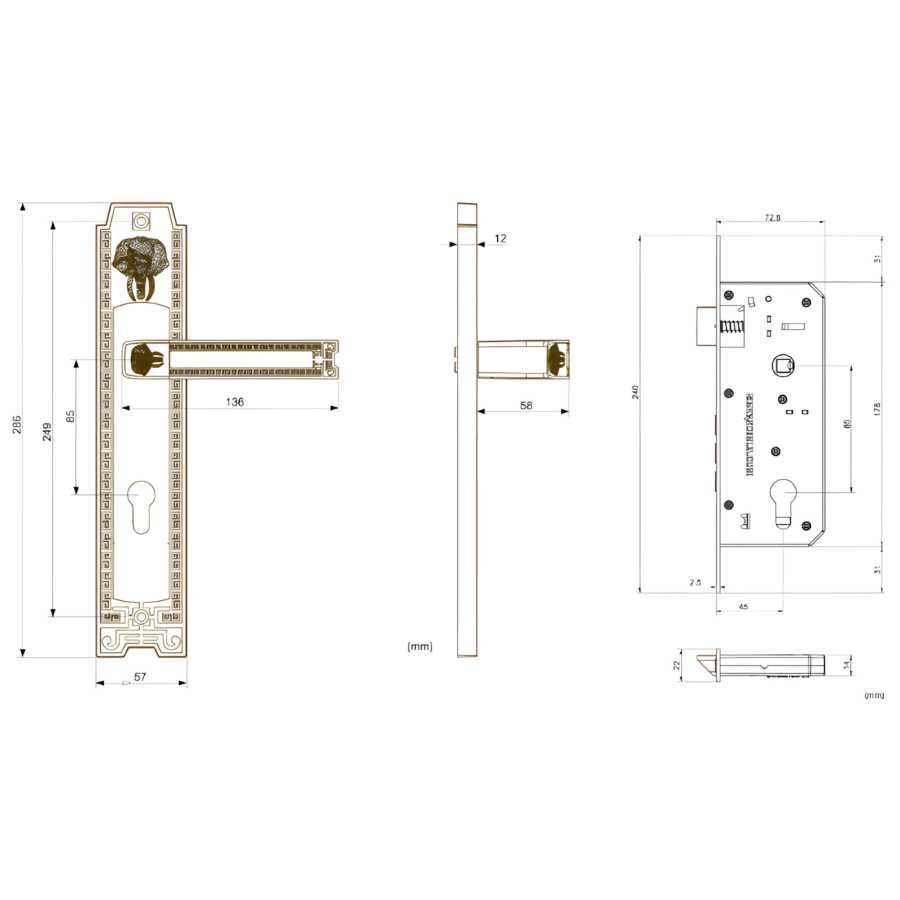 Chất liệu: Đồng vàng (Tay ốp, Then khóa), Thân Inox/Thép mạ Zn.