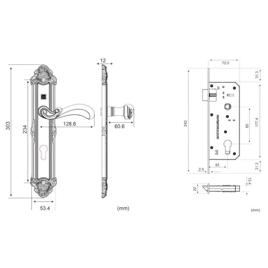 Chất liệu: Đồng vàng (Tay ốp, Then khóa), Thân Inox/Thép mạ Zn.