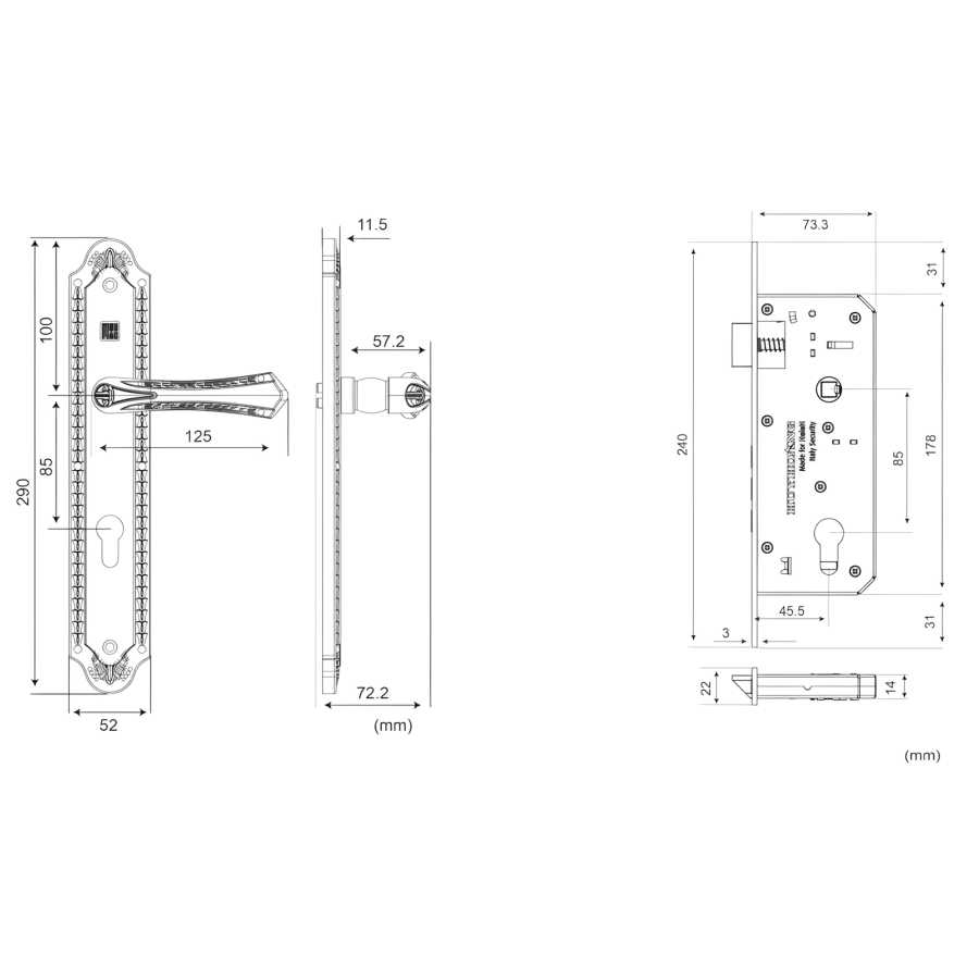 Chất liệu: Đồng vàng (Đồng thau - Tay ốp, Then khóa), Thân Inox/Thép mạ Zn.