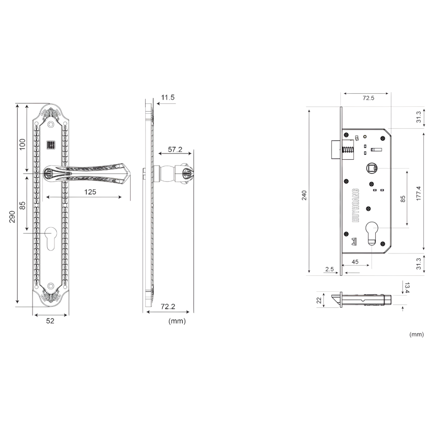 Chất liệu: Đồng vàng (Đồng thau - Tay ốp, Then khóa), Inox (Thân khóa), Tôn thép mạ Zn (Chi tiết bên trong).