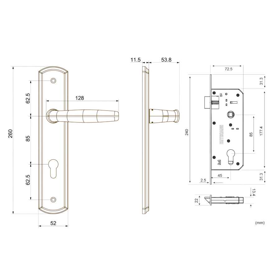 Chất liệu: Đồng vàng (Đồng thau - Tay ốp, Then khóa), Inox (Thân khóa), Tôn thép mạ Zn (Chi tiết bên trong).