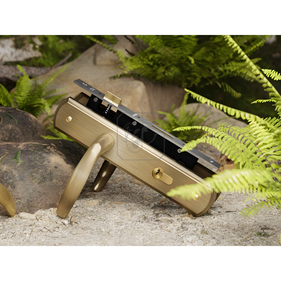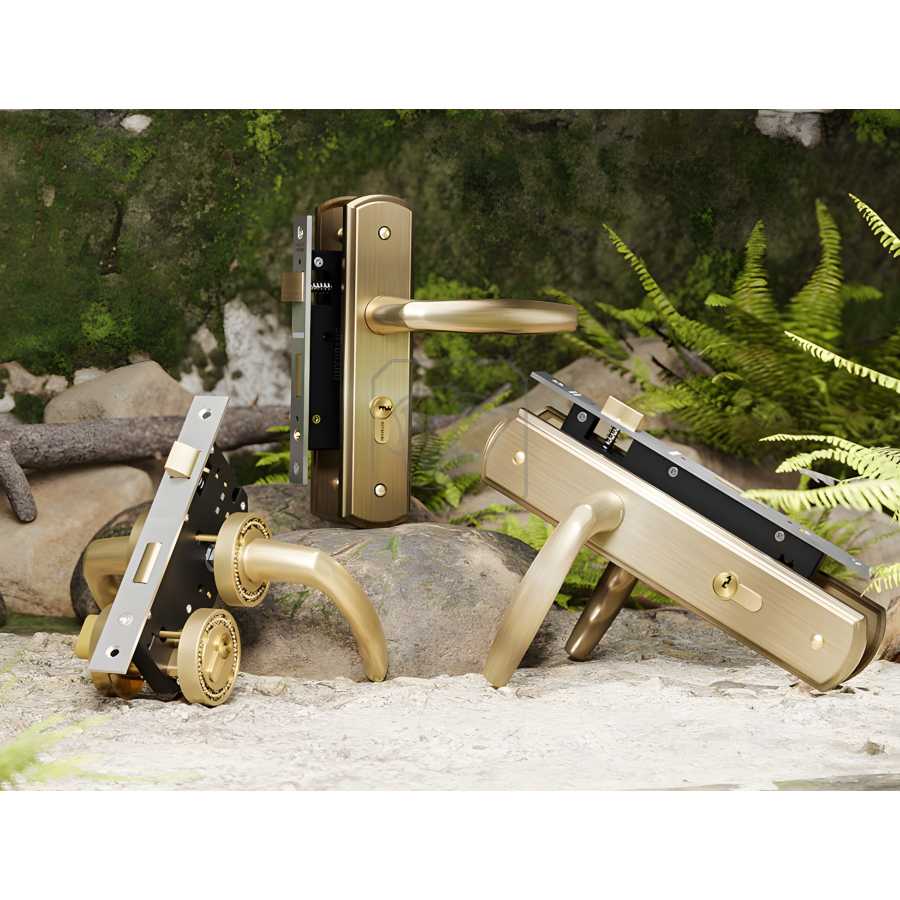 Chất liệu Đồng Thau Sang Trọng: Tay ốp khóa được sản xuất bằng đồng vàng (đồng thau) và xử lý bề mặt tạo xước, mang lại vẻ ngoài ấn tượng, sang trọng và khả năng chống ăn mòn tốt.