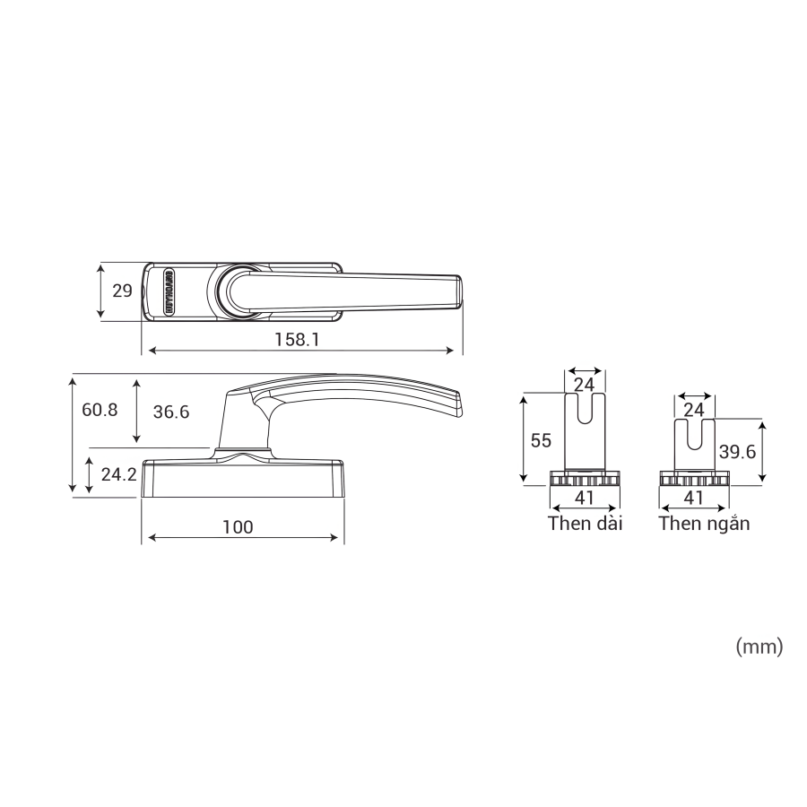 Phụ kiện đi kèm: Thanh răng ngắn hoặc dài (tùy hệ cửa nhôm)