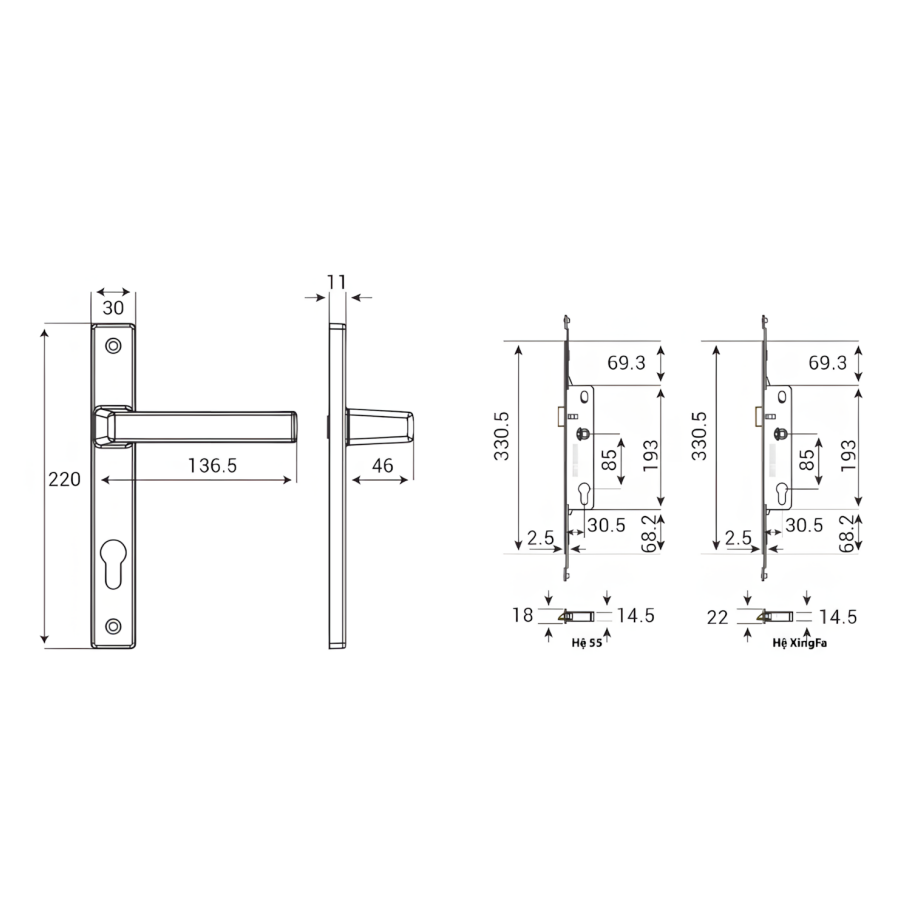 Chuyên dụng cho Nhôm Hệ Đa Dạng: Khóa có 2 phiên bản thân phù hợp với các loại nhôm hệ thông dụng (Hệ 55, Hệ XingFa) và 2 phiên bản ốp phụ phù hợp cho cửa 1 cánh hoặc 2 cánh.