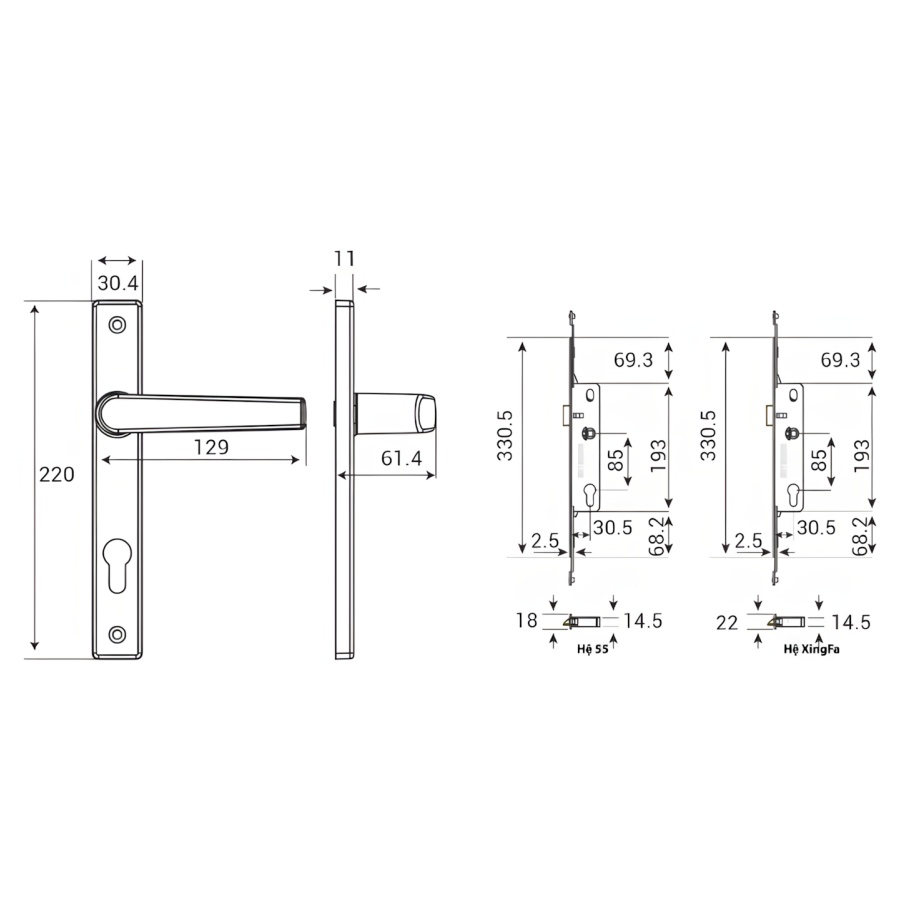 Chuyên dụng cho Nhôm Hệ Đa Dạng: Khóa có 2 phiên bản thân phù hợp với các loại nhôm hệ thông dụng (Hệ 55, Hệ XingFa) và 2 phiên bản ốp phụ phù hợp cho cửa 1 cánh hoặc 2 cánh.