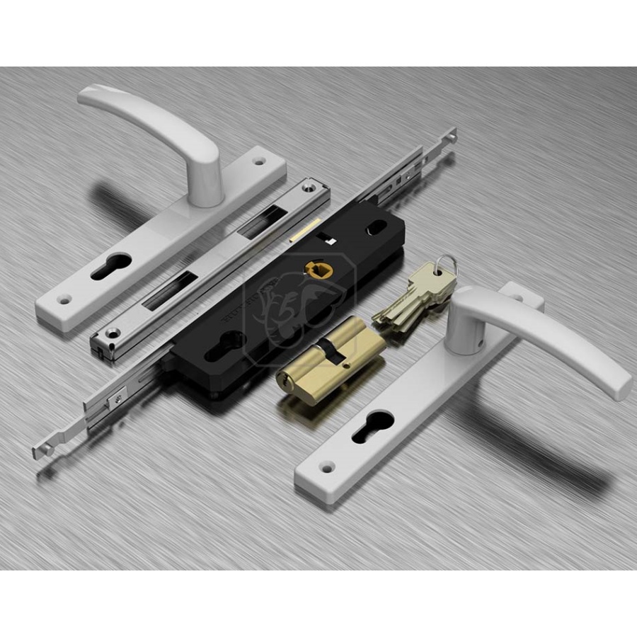 Khóa đa điểm Huy Hoàng AP 80: Tay nắm Hợp Kim, sơn tĩnh điện Trắng. Chuyên dùng cho cửa nhôm hệ/Xingfa. Then trượt đồng thau, khóa đa điểm an toàn.