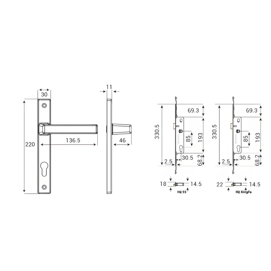 Chuyên dụng cho Nhôm Hệ Đa Dạng: Khóa có 2 phiên bản thân phù hợp với các loại nhôm hệ thông dụng (Hệ 55, Hệ XingFa) và 2 phiên bản ốp phụ phù hợp cho cửa 1 cánh hoặc 2 cánh.