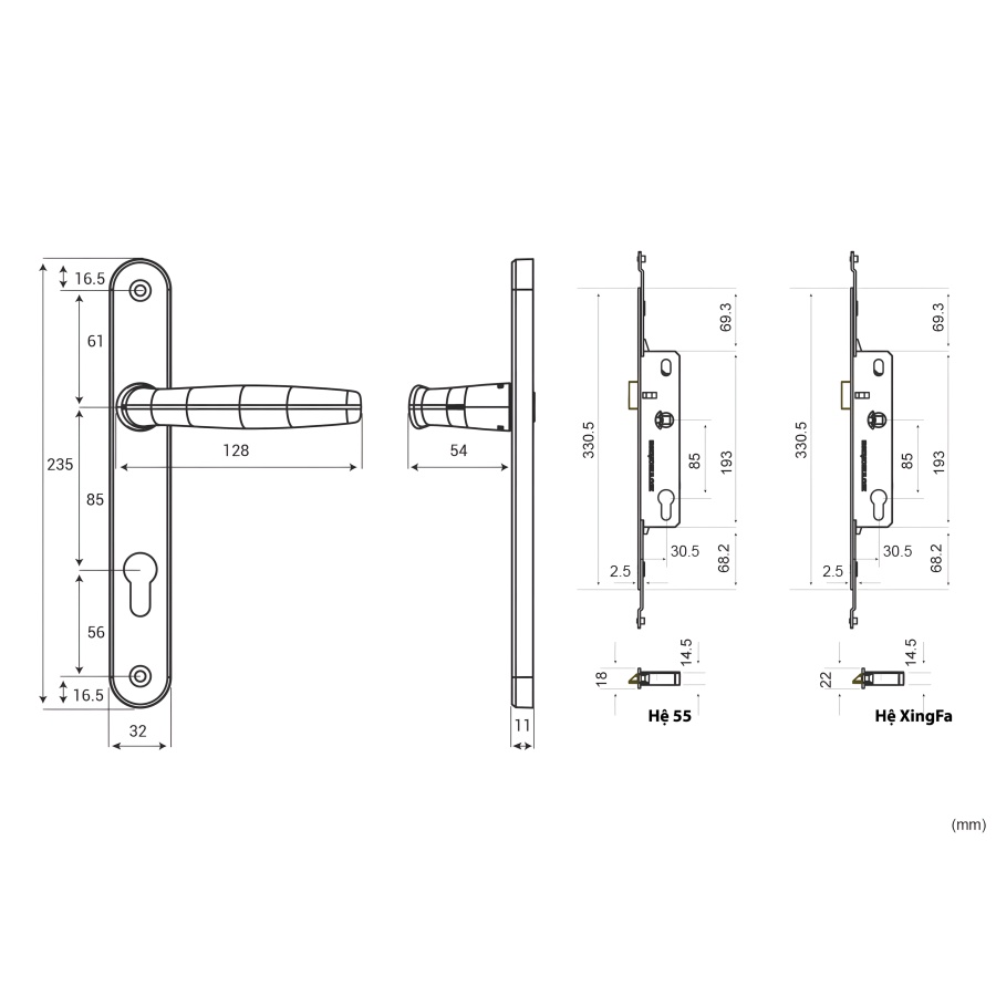 Chuyên dụng cho Nhôm Hệ Đa Dạng: Khóa có 2 phiên bản thân phù hợp với các loại nhôm hệ thông dụng (Hệ 55, Hệ XingFa) và 2 phiên bản ốp phụ phù hợp cho cửa 1 cánh hoặc 2 cánh.