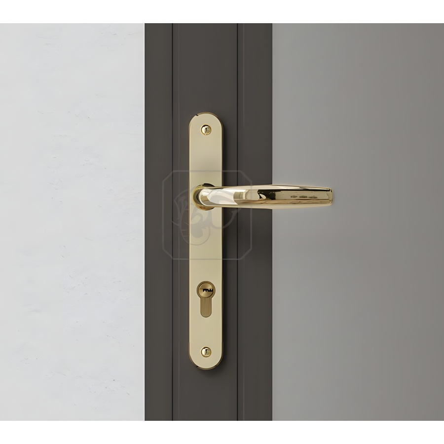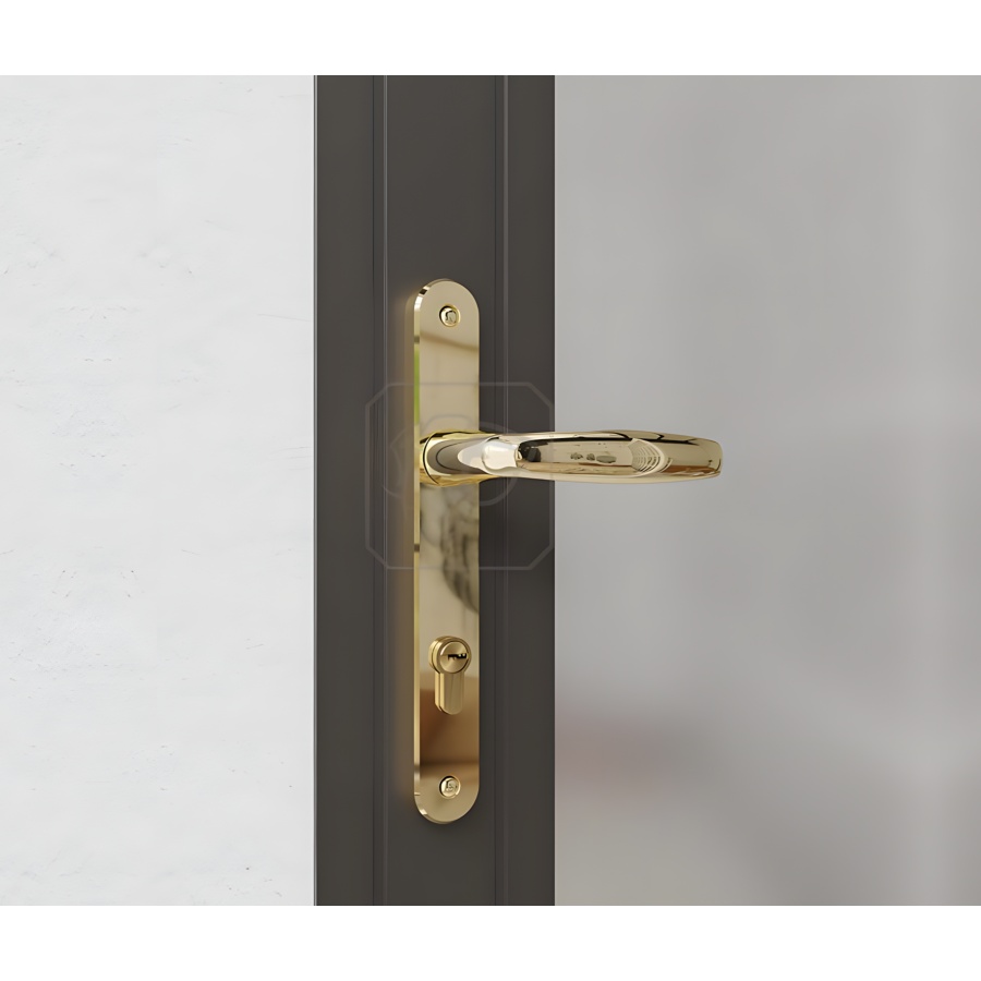 Thiết kế Đồng Thau Sang Trọng: Tay ốp khóa được sản xuất bằng đồng vàng (đồng thau), mang lại vẻ ngoài ấn tượng, sang trọng và khả năng chống ăn mòn tốt.