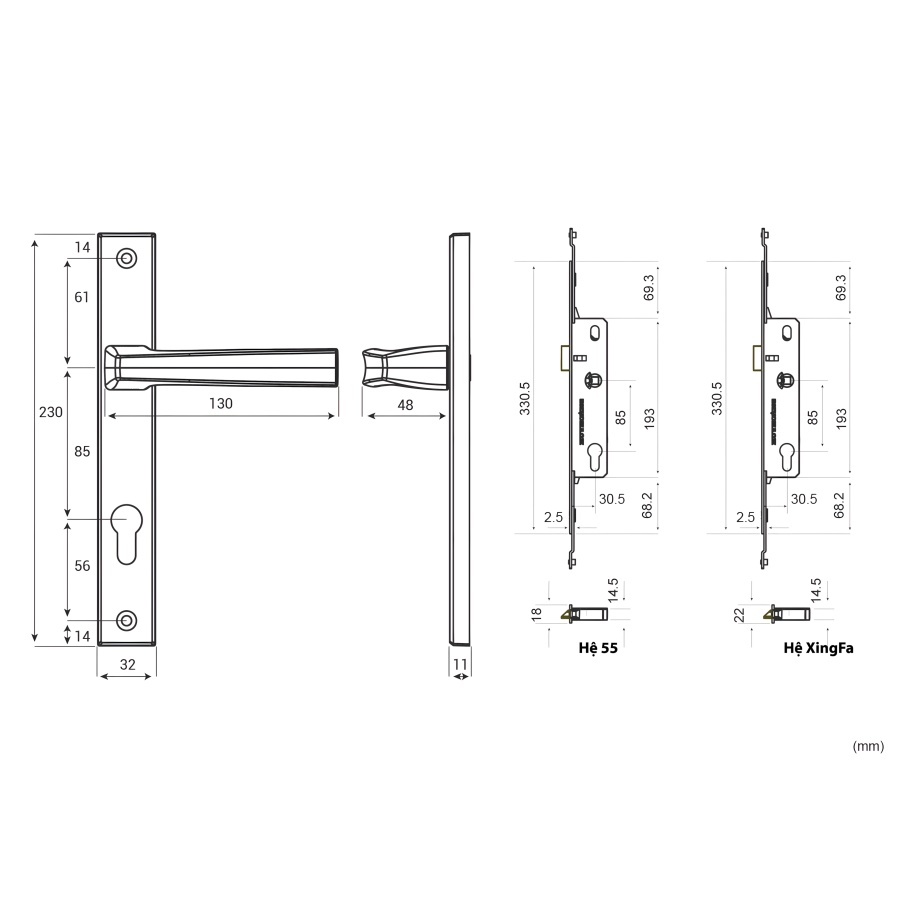 Chuyên dụng cho Nhôm Hệ Đa Dạng: Khóa có 2 phiên bản thân phù hợp với các loại nhôm hệ thông dụng (Hệ 55, Hệ XingFa) và 2 phiên bản ốp phụ phù hợp cho cửa 1 cánh hoặc 2 cánh.