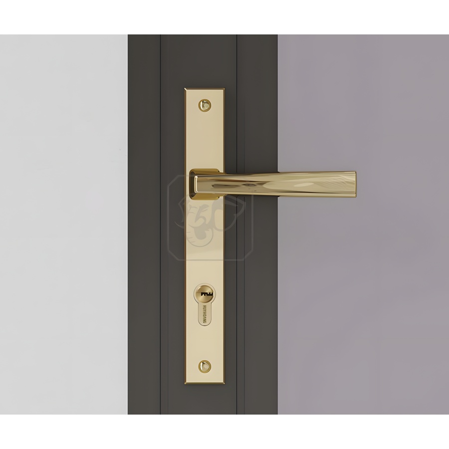 Thiết kế Đồng Thau Sang Trọng: Tay ốp khóa được sản xuất bằng đồng vàng (đồng thau), mang lại vẻ ngoài ấn tượng, sang trọng và khả năng chống ăn mòn tốt.