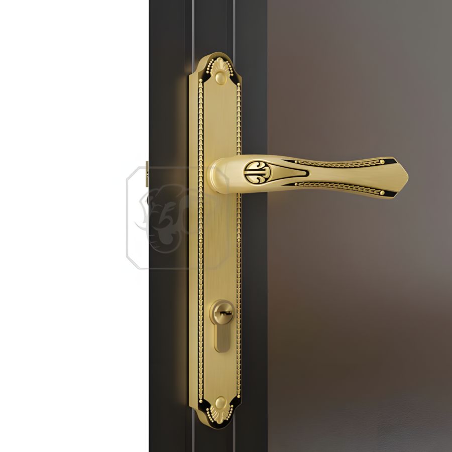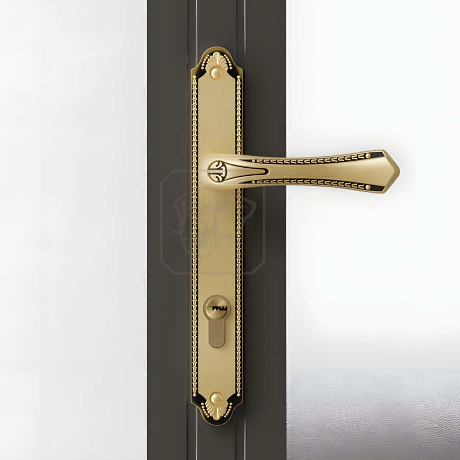 Thiết kế Tân cổ điển: Tay ốp khóa được sản xuất bằng đồng vàng (đồng thau), bề mặt được đánh xước. Họa tiết trang trí mang phong cách tân cổ điển mang đến sự ấn tượng và thu hút.