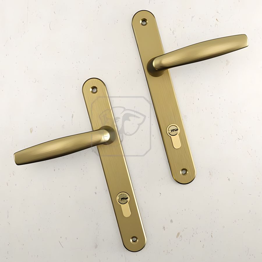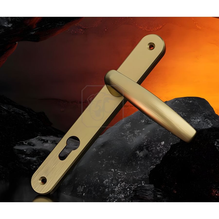 Thiết kế Độc đáo: Tay ốp khóa được sản xuất bằng vật liệu đồng vàng (đồng thau), bề mặt được đánh xước, tạo sự độc đáo và ấn tượng cho sản phẩm.
