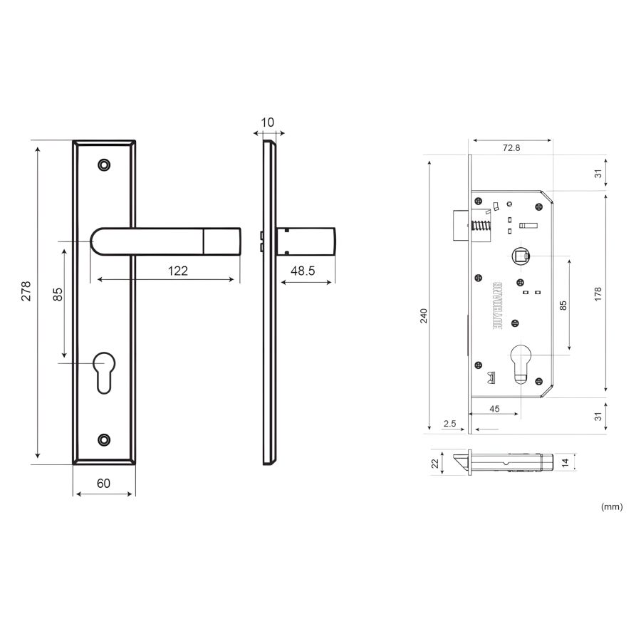 Chất liệu: Hợp kim ZDC-2 (Tay ốp), Đồng vàng (Then khóa, Ổ khóa), Thân thép 1.5mm mạ Zn.