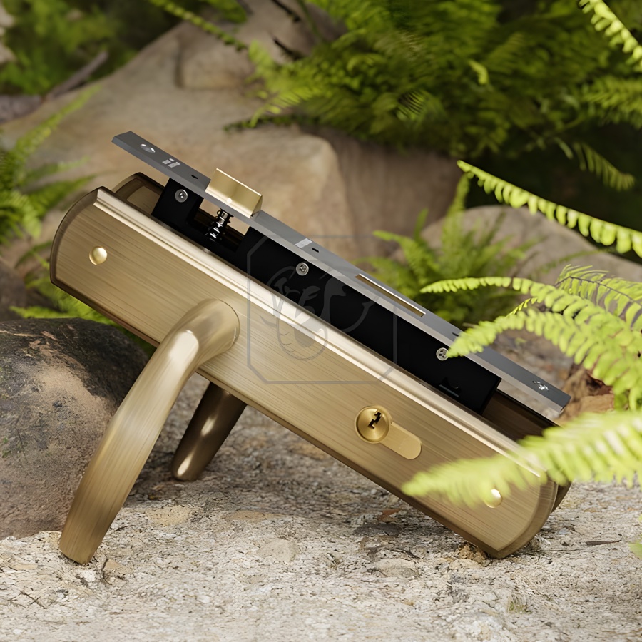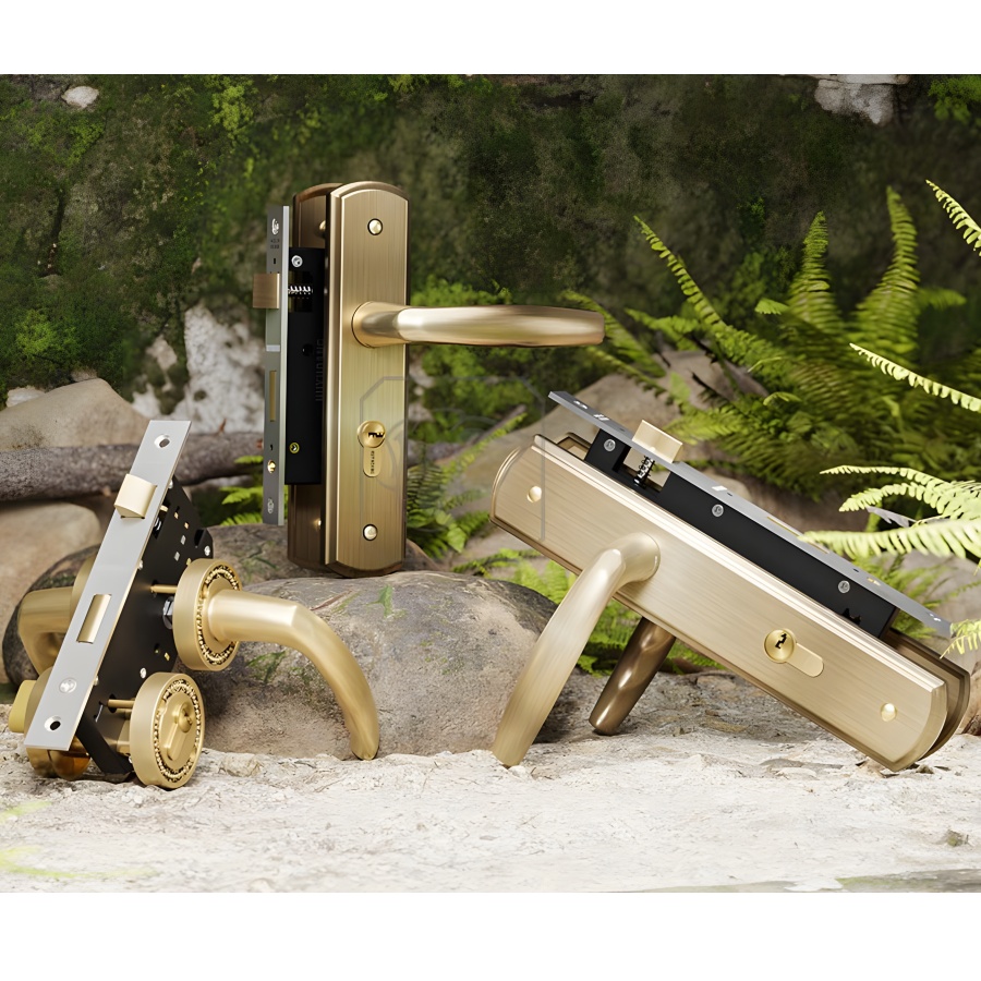 Thiết kế Sang trọng & Chất liệu Đồng Vàng: Tay ốp khóa được sản xuất bằng đồng vàng (đồng thau) với quy trình xử lý xước bề mặt, mang lại vẻ ngoài ấn tượng, sang trọng và bền bỉ.