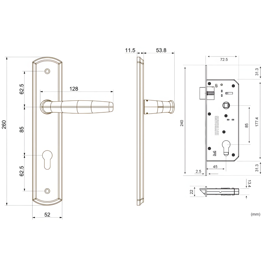 Chất liệu: Đồng vàng (Tay ốp, Then khóa), Inox/Thép mạ Zn (Thân khóa).
